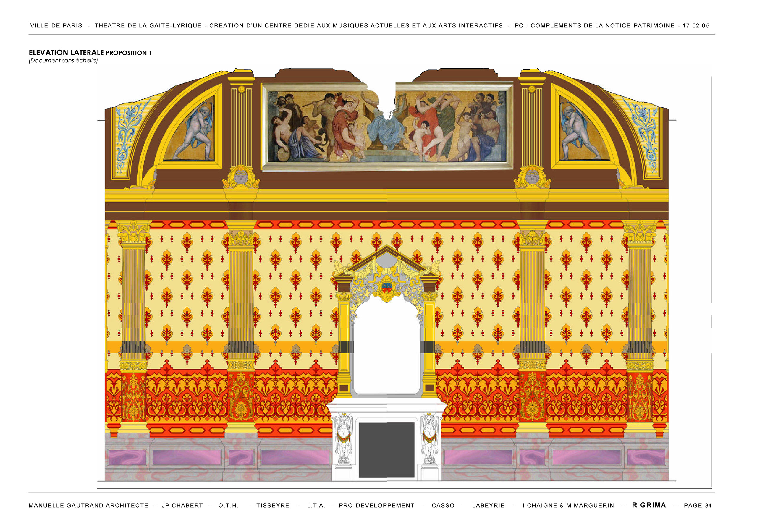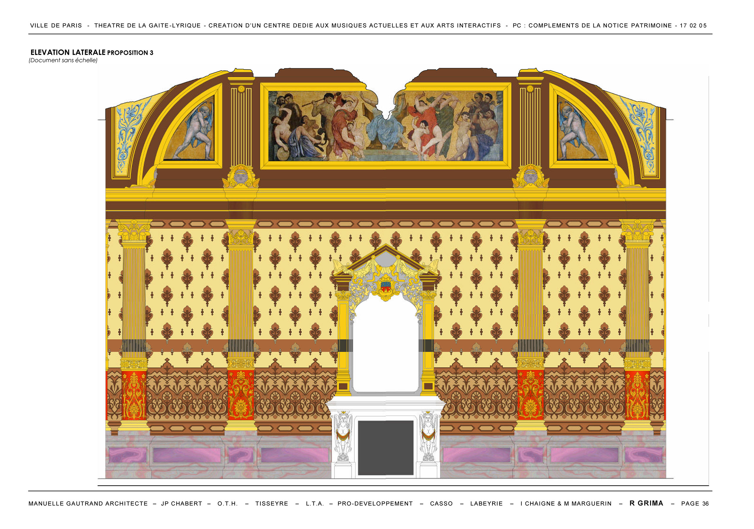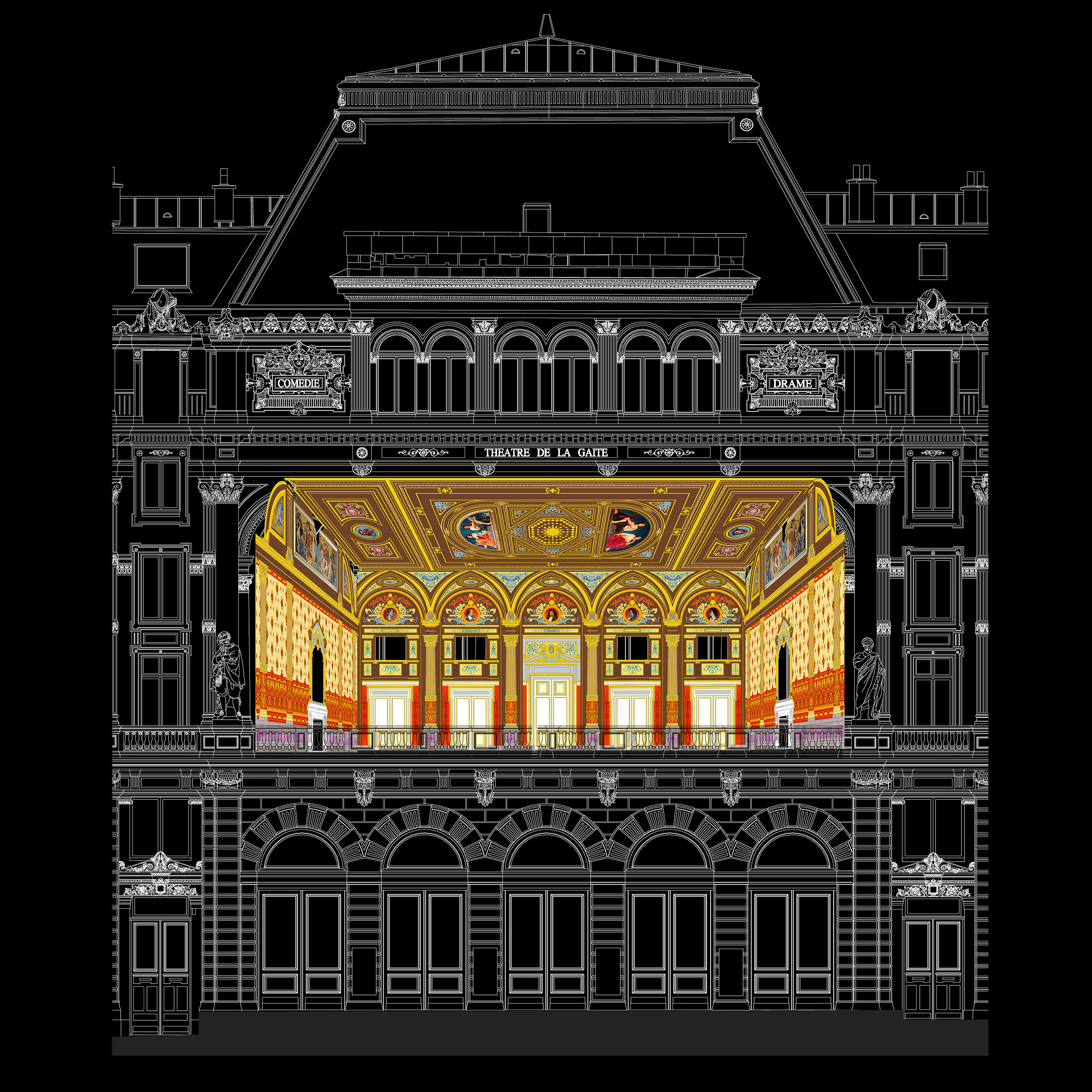 Restauration des parties historiques originelles (façade, toiture, vestibule, foyer) du Théâtre de la Gaité Lyrique (ISMH) érigé en 1862 par Adolphe Cusin, dans le cadre du projet de réhabilitation de l’ensemble du site en centre culturel consacré aux musiques actuelles et aux arts numériques.